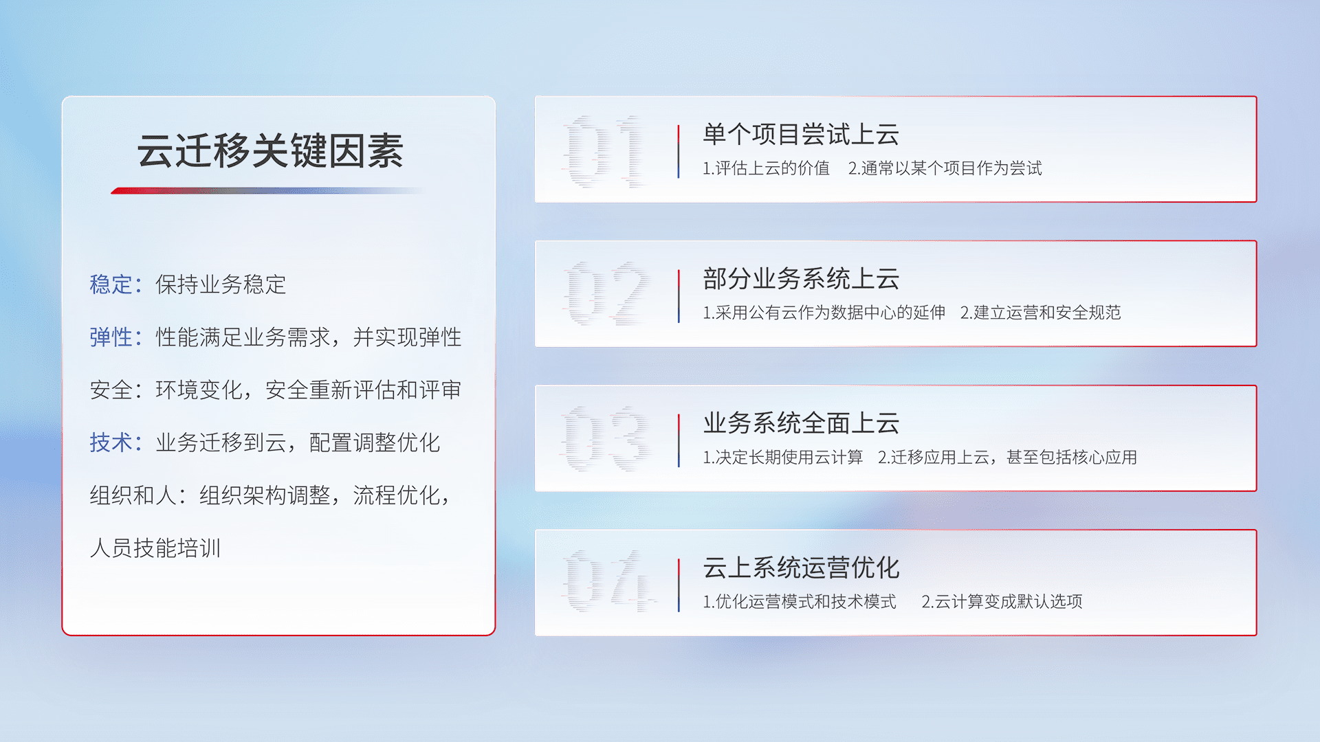 结合实际业务,,,,从规划设计、、、、云平台选型、、、云原生改造、、、数据迁移、、、、集成交付,,,,迁移全过程为客户识别最佳上云路径,,做好风险识别管理,,设计网络架构、、、身份权限、、安全审计合规、、、操作审计、、日志审计、、、、监控告警策略、、、多站点容灾设计等,,,,对云上基础设施进行整体规划,,,,提升IT治理水平,,,,以满足弹性、、、、高可用、、高性能的需求。。。。